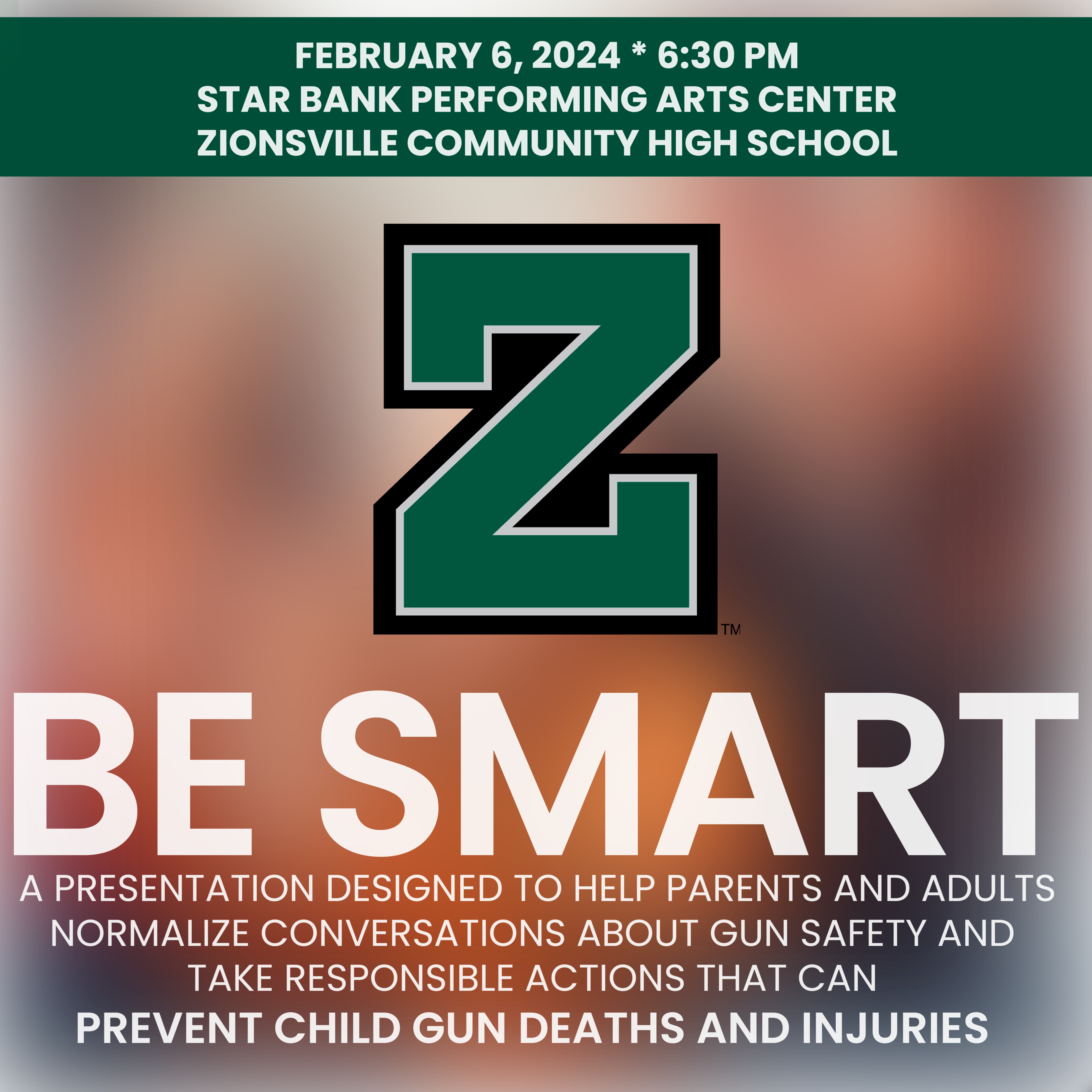 Save the date for a districtwide presentation on February 6, 2024, at 6:30 p.m. hosted in the ZCHS Star Bank Performing Arts Center. Representatives from Be SMART have prepared a presentation and are extending an invitation for a conversation concerning children, firearms, and responsible gun storage.