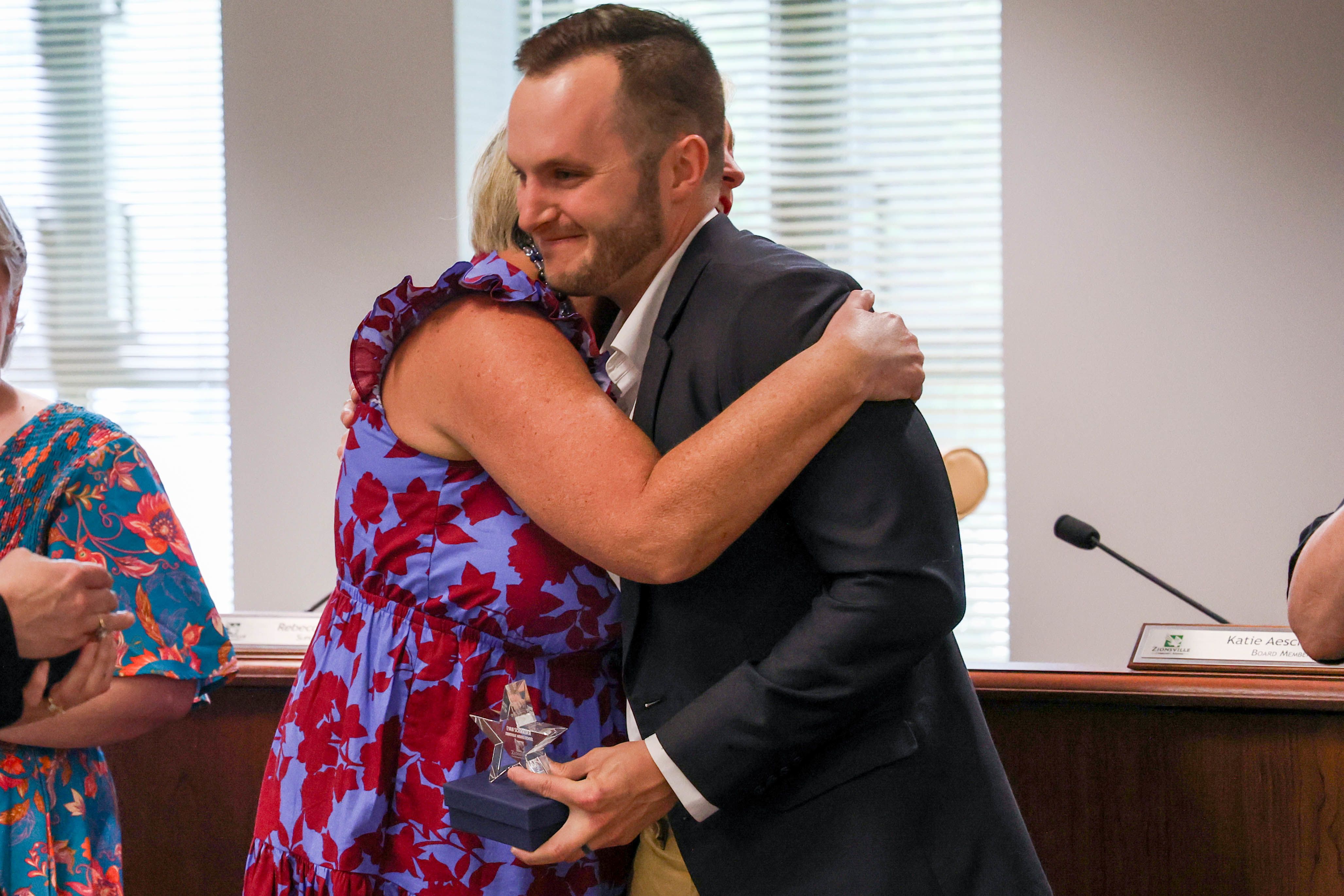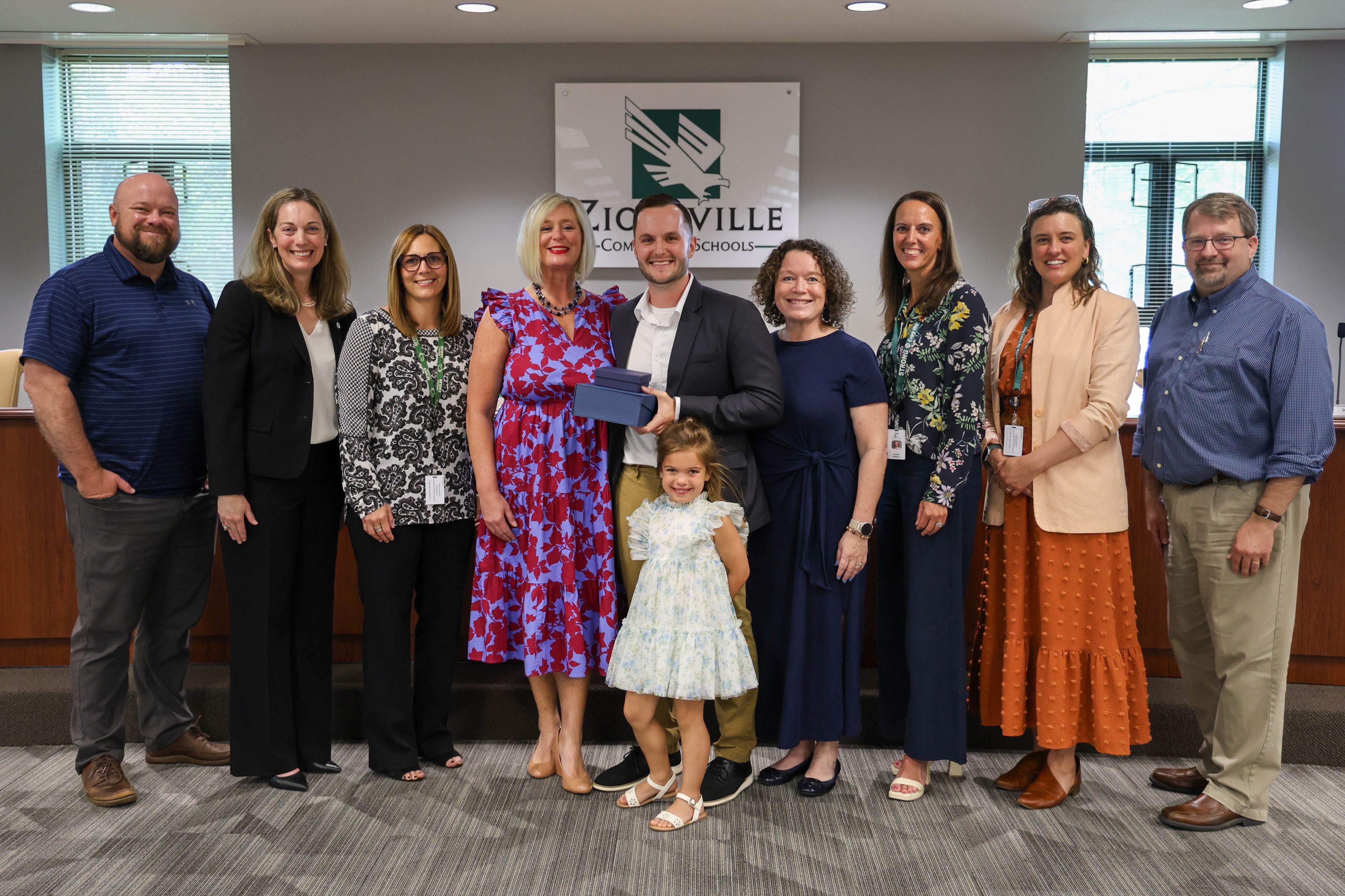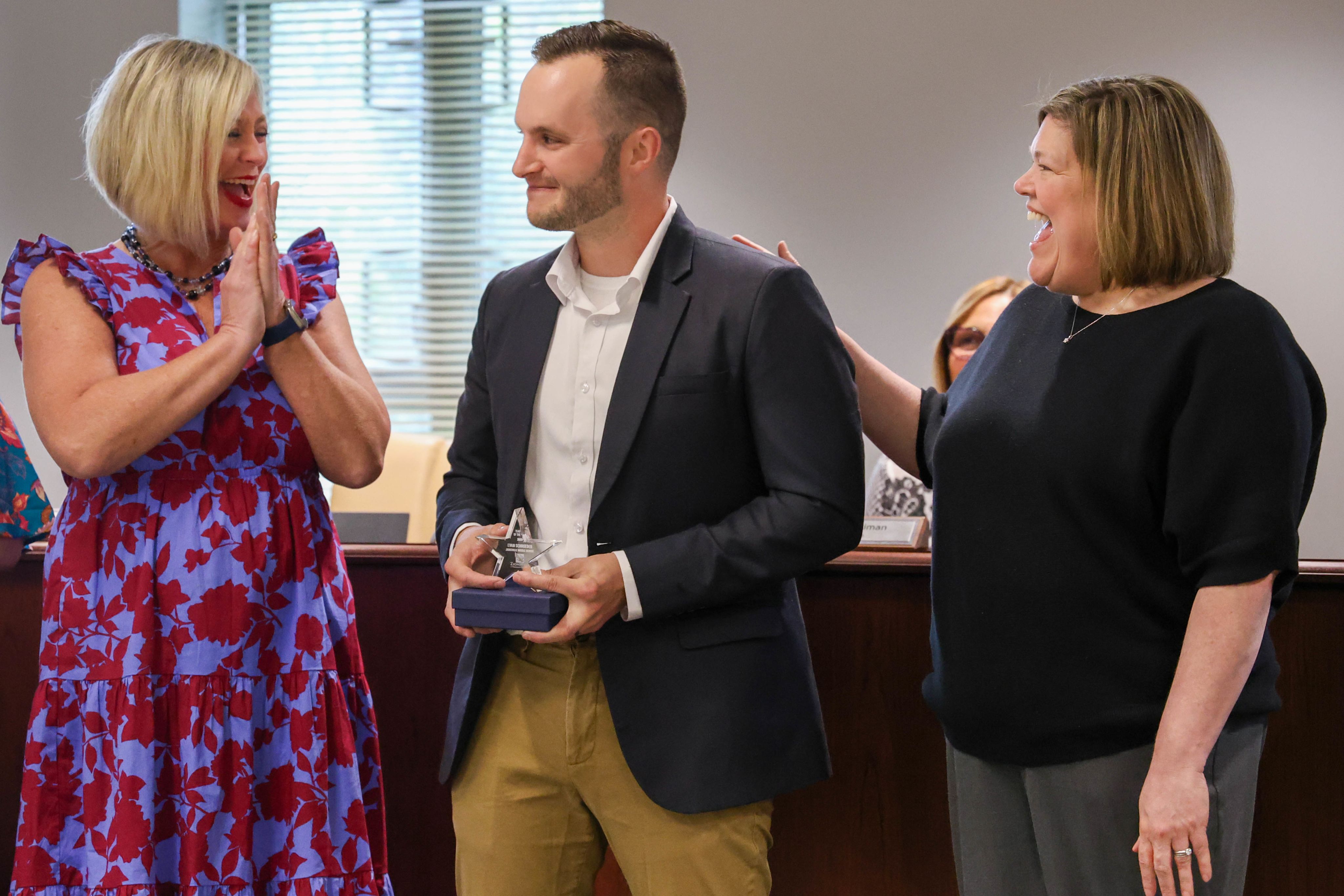 During the May Board of School Trustees meeting, Zionsville Community Schools celebrated outstanding educators by recognizing the Teachers of the Year from each school. Among this distinguished group, Zionsville Middle School Teacher Evan Schroeder was named the District Teacher of the Year and will represent ZCS in the state competition.